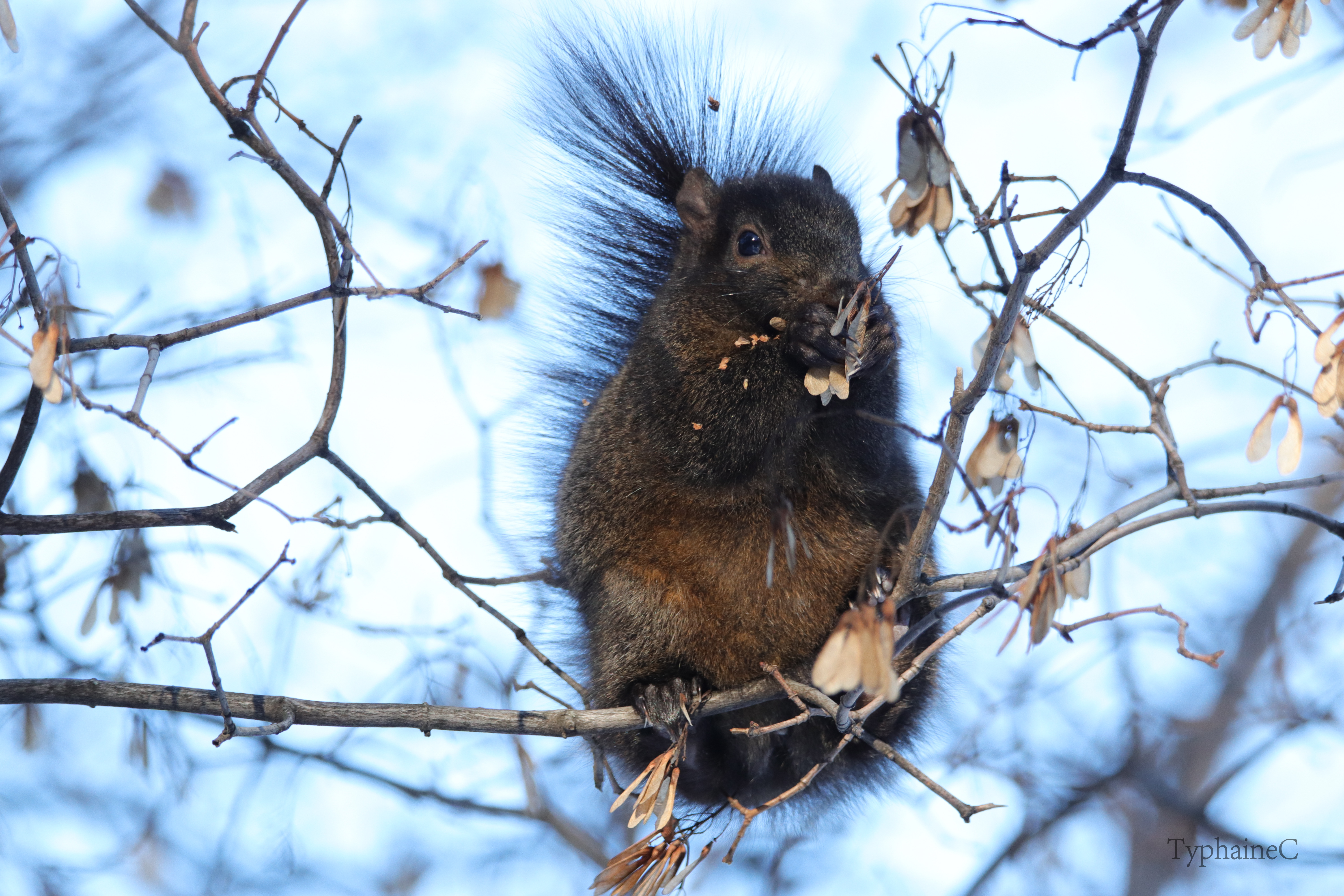 Le premier, l’ÉCUREUIL GRIS (Sciurus carolinensis), se rencontre aisément dans les parcs urbains et leurs alentours, comme j’ai pu le constater dès mes premiers jours à Montréal ! Leur prolifération cause néanmoins de nombreux dégâts : fuite de certains oiseaux, éventrement des poubelles dans les rues, grignotage des câbles dans les moteurs de voitures, dégustation des matériaux isolants dans les maisons … etc. Bref, tout un tas d’agissements qui salissent la réputation de ce petit animal devenu peu farouche !